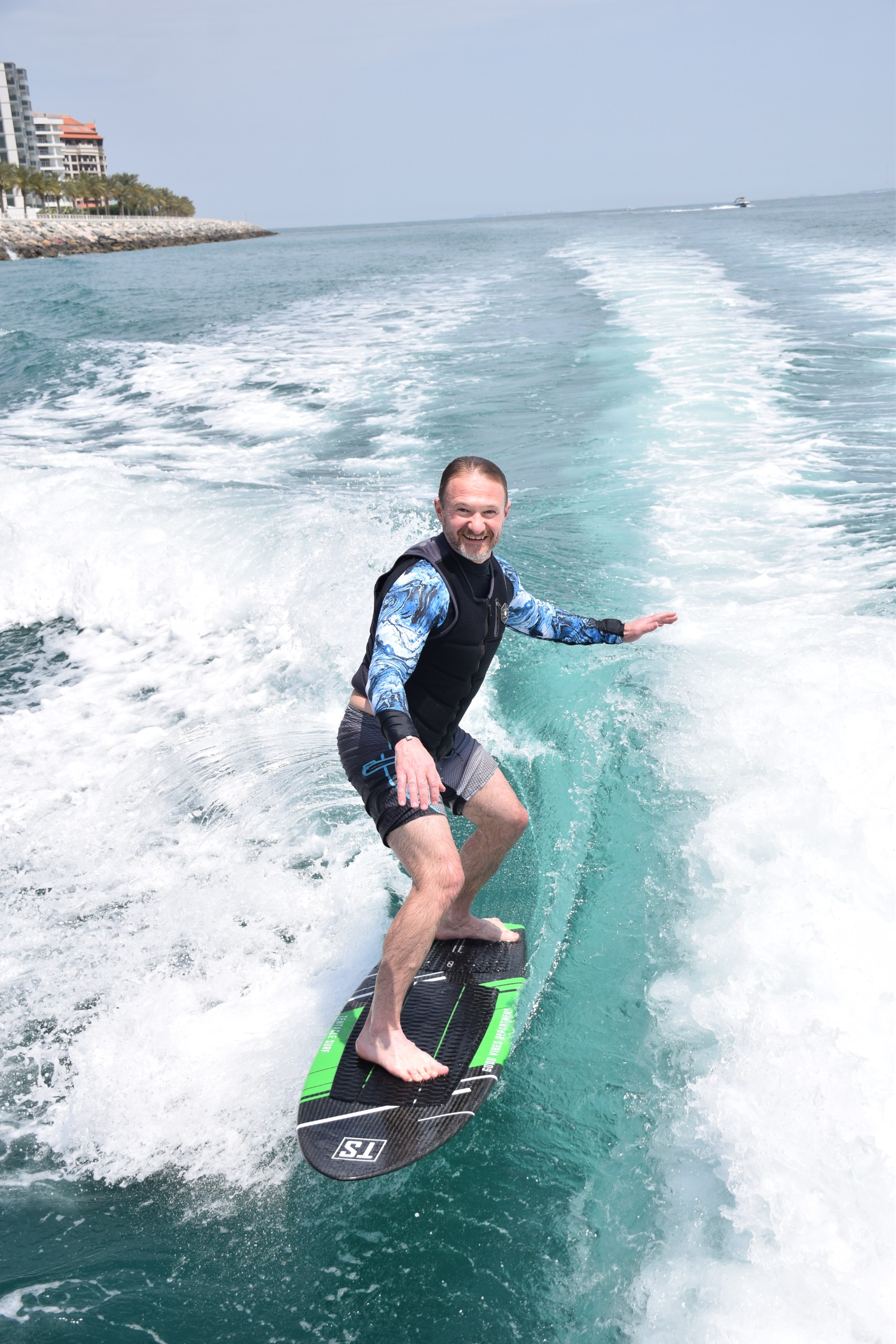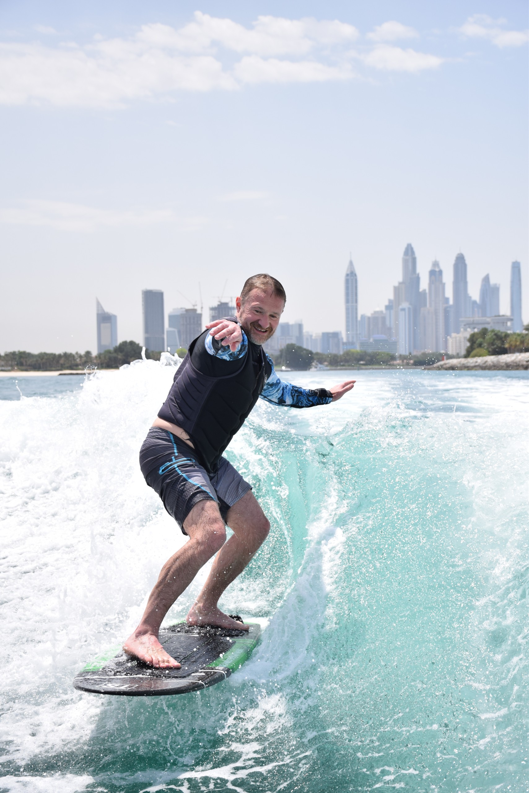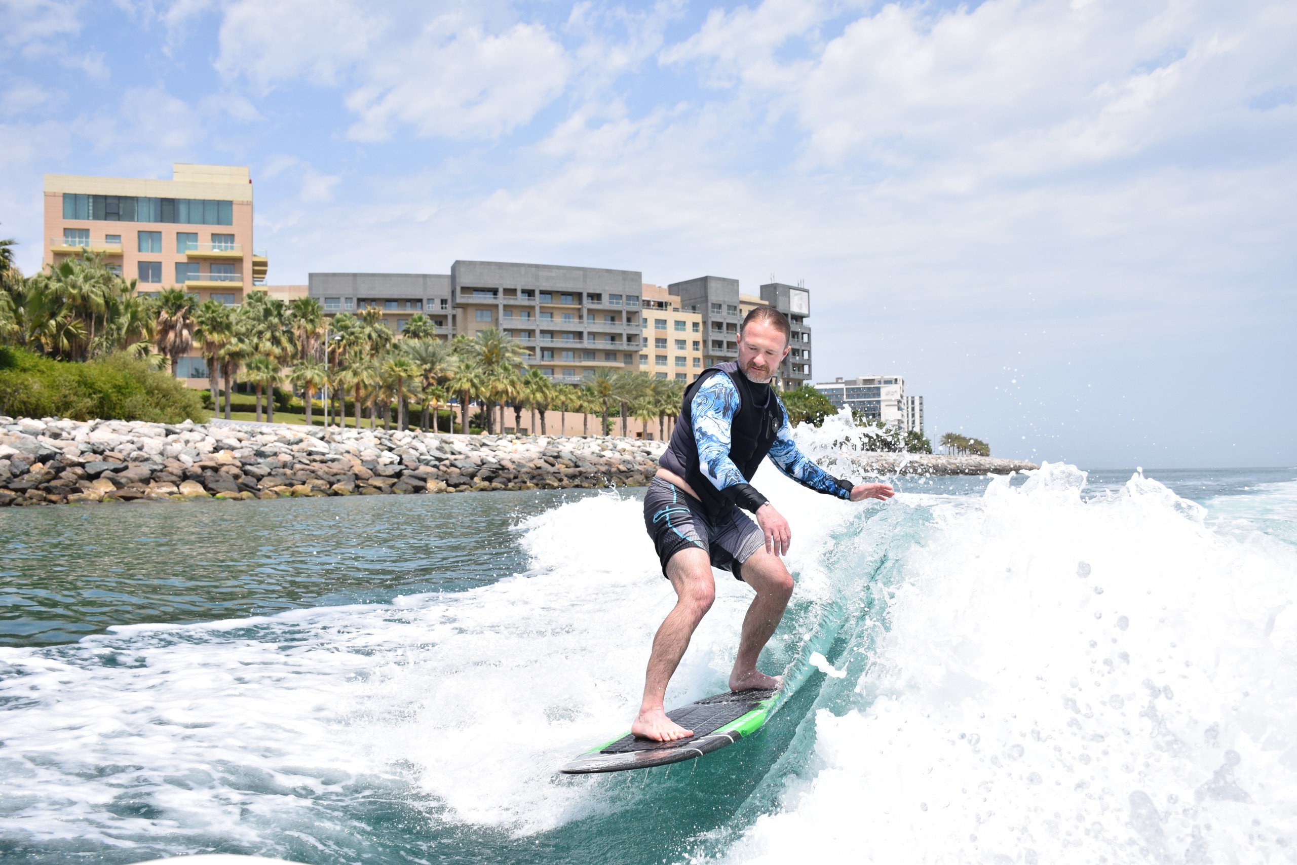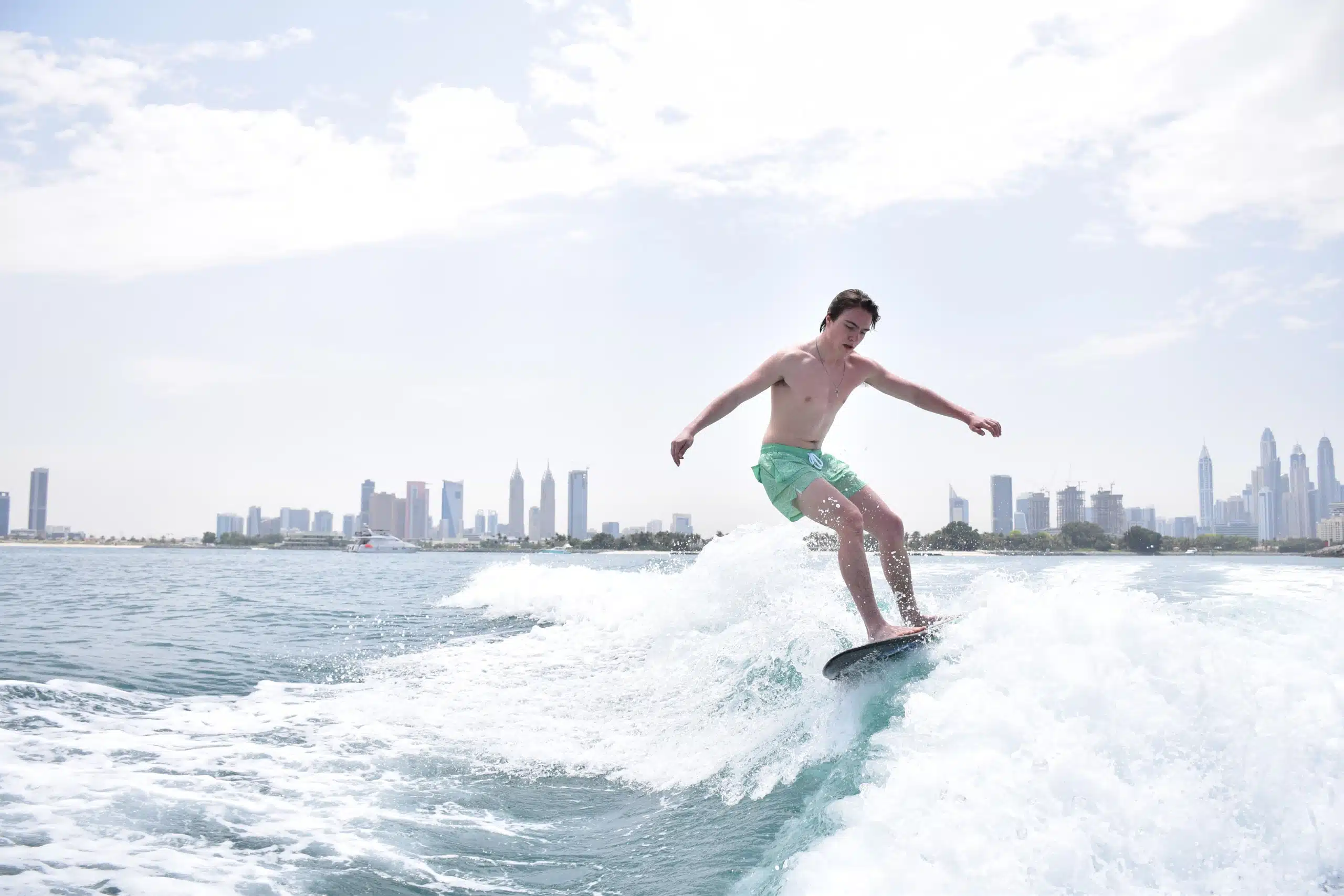 Your wakesurf session starts at Dukes The Palm, Palm Jumeirah, Dubai. From this lively hub, you’ll head out across calm waters, where our expert instructors will guide you through an unforgettable experience. Feel the rush as you carve through the waves, surrounded by Dubai’s glittering skyline and sunlit horizons.